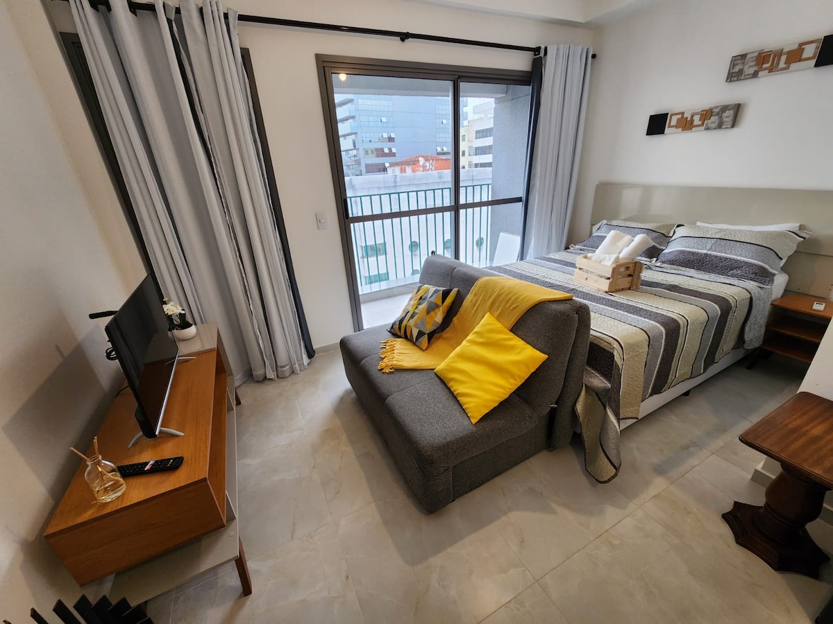 Cozy Kitnet 非常適合短期住宿、家庭辦公室和長季。 步行3分鐘即可抵達Liberdade地鐵站 - WiFi 500mb -吊扇 -機器熔巖3公斤,乾燥1公斤 - Floor Varal - Samsung 50 吋智能電視,附可調節支架 - 支援筆記本電腦、燈、時鐘的桌子,並配有溫度和濕度標記。 -可伸縮桌 -迷你吧 -濾水器 -廚房空氣淨化器 -電磁爐烹飪 -微波爐 -吹風機 -衛生淋浴
