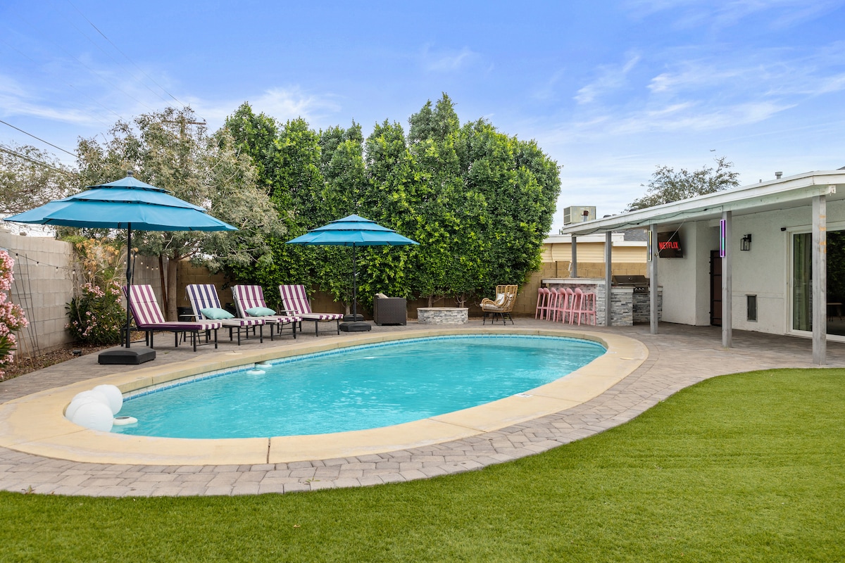 美麗舒適!位置便利,距離坦佩市中心和Mill Ave僅3個街區! 這間精美翻新的3居室旅居配有加大雙人床、標準雙人床、雙人床和單人床,以及一張拉出式梳化床。 超棒的大型石英島廚房、咖啡吧和私人門禁院子。 配備舒適的浸泡式浴缸、高速WiFi和辦公桌,方便你遠程工作,或透過遊戲和智能電視放鬆身心。 靠近ASU、Tempe Town Lake。 來享受坦佩的一切! 執照號碼: STR-000985