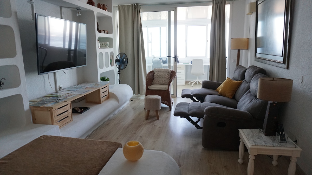 在這間寬敞明亮的60平方公尺公寓中享受舒適的住宿體驗,並配有10平方公尺的露臺,可欣賞棕櫚馬市的美景。 主要特色: 設備齊全的廚房: 翻新的浴室:配有1.8公尺的淋浴託盤和洗衣機,可容納8公斤。 舒適的客廳:配備55英寸智慧電視、沙發牀 主臥室:配有雙人牀、吊扇、32英寸電視和內置衣櫃。 私人10平方公尺的露臺,可放鬆身心,享受城市景觀。