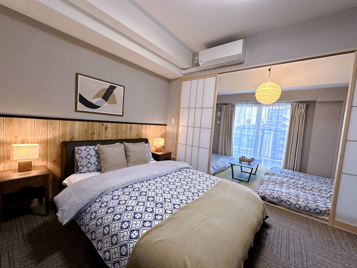 55平!2卧室可入住7人,徒步4分钟达到黑门市场,日本桥,6分钟道顿堀,心斋桥,难波,可提前入住
