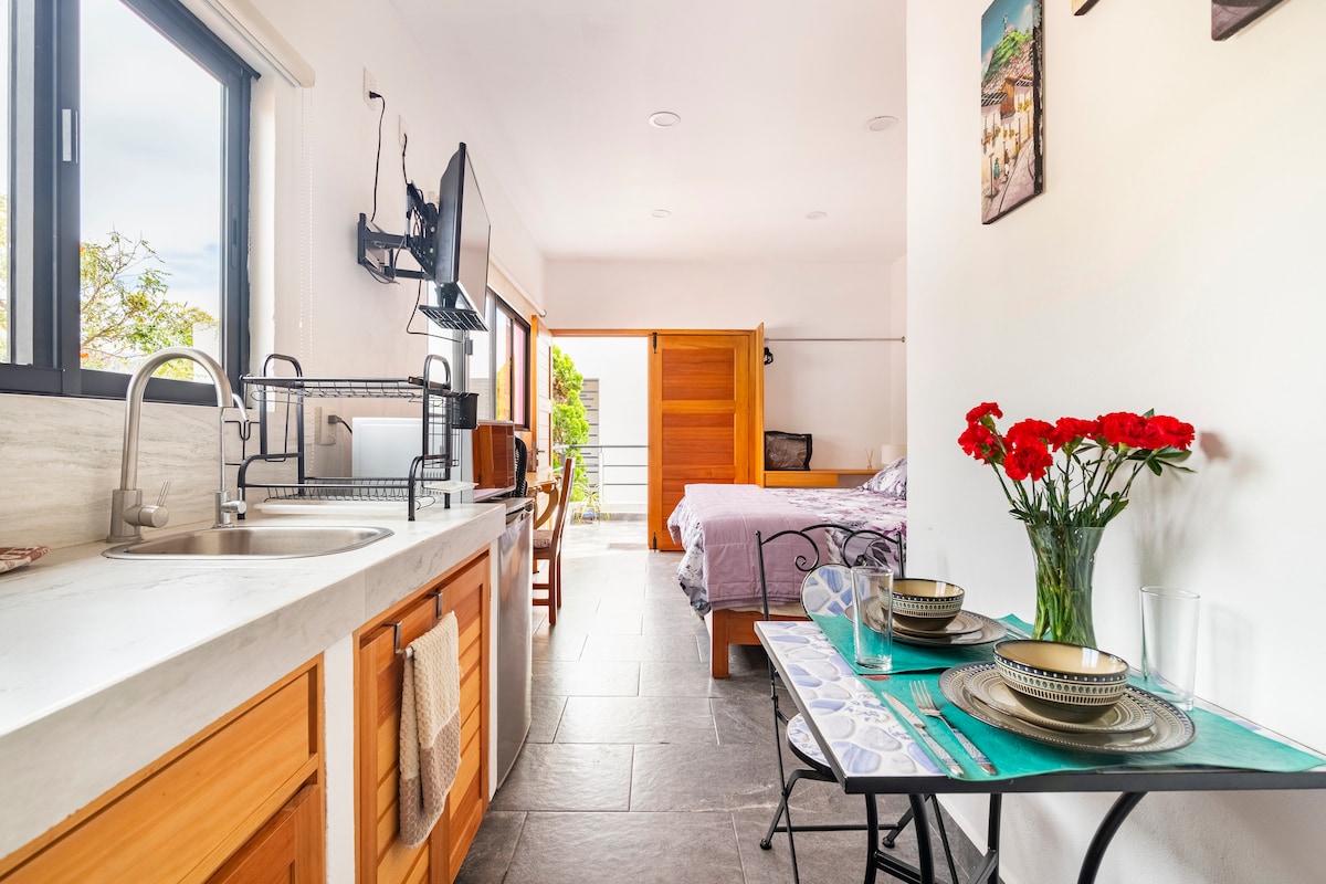 設備齊全的私人舒適平房,1 張床、小廚房、浴室、按摩浴缸。可使用花園、露臺和游泳池。 設備超級齊全的私人平房、1 張床、設備齊全的小廚房、全套浴室、按摩浴缸。可使用花園、Palapa 和泳池。 室外廚房配有基本烹飪用品、鹽、油、糖、胡椒等。