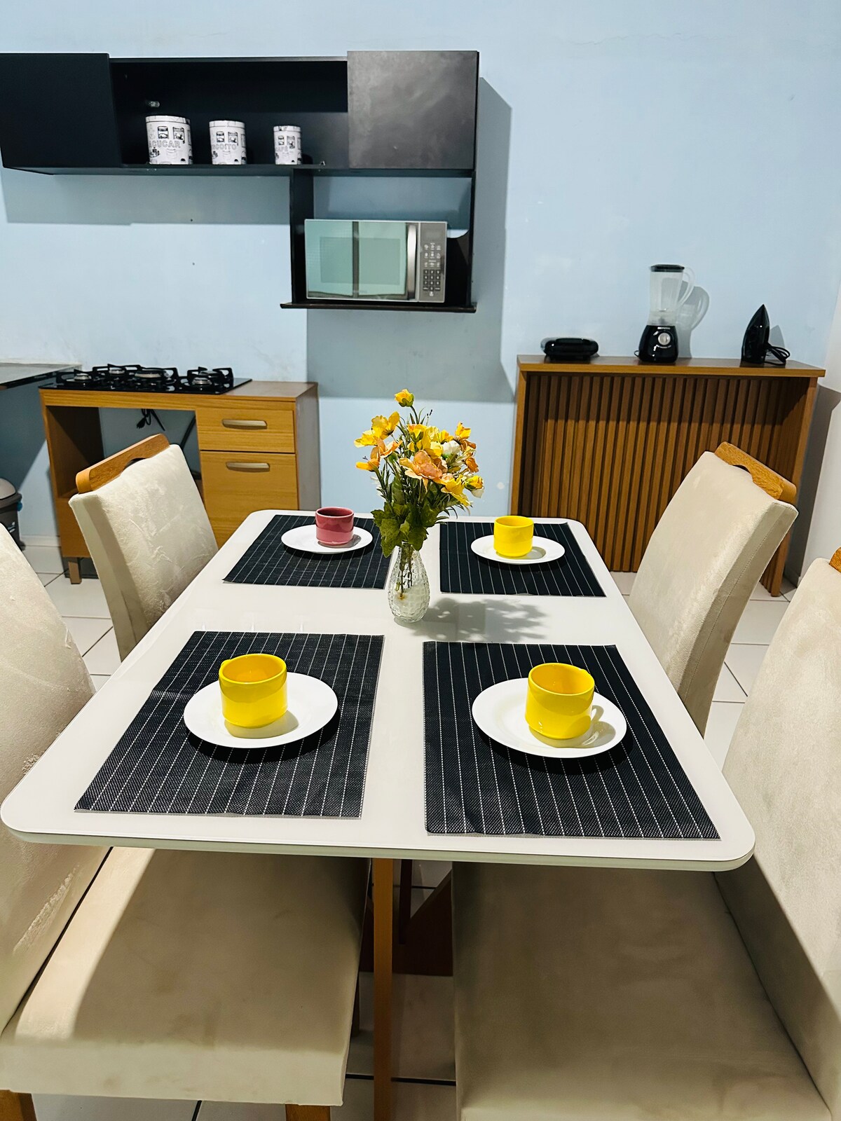 舒適的公寓,溫馨的家庭氛圍,提供無線網路、智慧電視、客廳電視、瓷磚地板,乾淨整潔,充滿魅力。公寓設有兩間臥室,其中一間套房配備一張雙人床(1.58米 x 1.98米),另一間臥室配備一張單人折疊床。廚房設施齊全,包括爐台、氣炸鍋、管道燃氣、攪拌機、微波爐、三明治機、防護屏、冰箱、臥室和客廳均配備分離式空調以及電淋浴。可欣賞特雷西納壯麗的日落美景。公寓不允許攜帶寵物入住。 Mateus Supermercado 和 Havan 前面