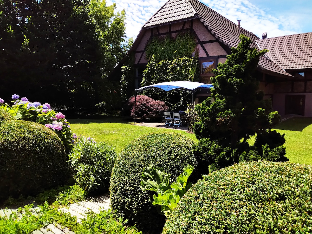 這是一個可以來放鬆身心的好地方,您可以在大型花園中安心休息,享受隱私。 非典型的阿爾薩斯住宅。在大型遊泳池中洗澡,與鳥兒一起唱歌、在花園、長凳上或在吊牀上的樹下放鬆身心,花時間生活,思考... 85歐元/晚/雙人牀房。 非常適合情侶或單身人士-最少2晚。每人早餐提供7.50歐元。