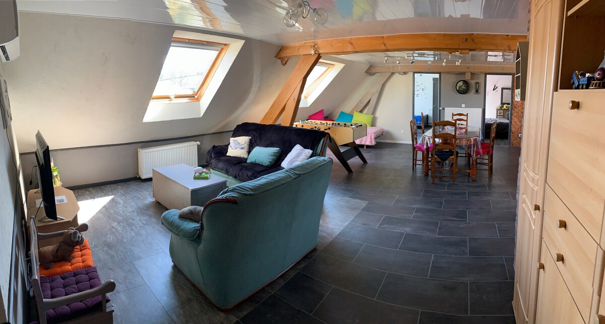 住宿位於一棟房子{公寓}內,有大客廳, 位於阿爾薩斯山 (Ballon d'ALSACE) 腳下的一個小村莊,有許多活動 *滑雪-雪橇-多個農場旅館- *樹頂探險、超輕型飛機飛行、騎小馬或馬、徒步旅行 - 6 月至 9 月底,下午 2 點至 6 點可使用泳池,需額外付費。 如需更多資訊,請與我們聯絡。