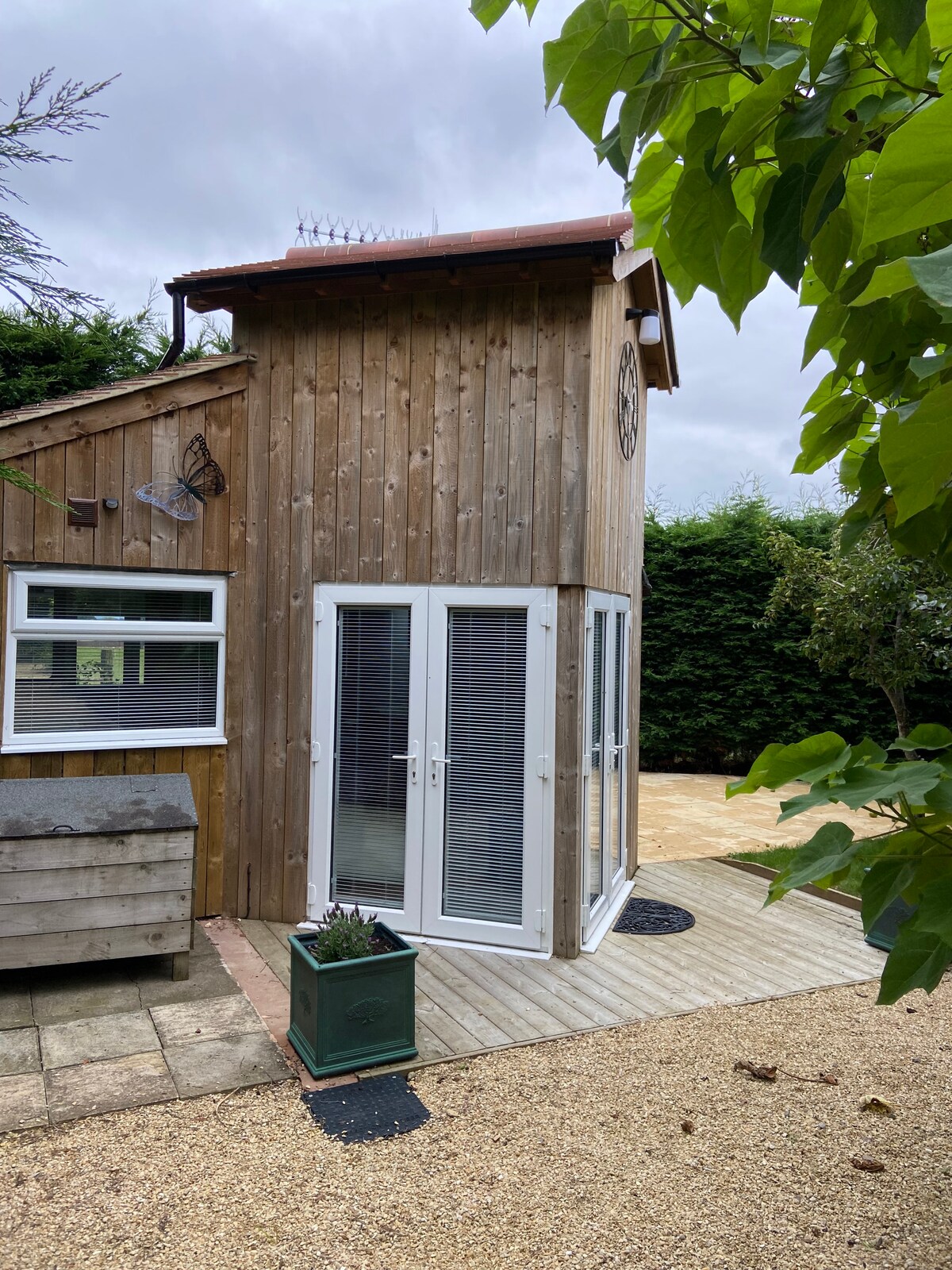 步行5分鐘即可抵達Stroud火車站,木製花園單間公寓通風且現代化,四周綠意盎然。它俯瞰我們的花園,除了火車(每小時僅2小時)之外,它很安靜,但也非常靠近漂亮的丘陵小鎮Stroud。 週六的農夫市場非常有趣,公園和步行都很壯觀。 我們的車道上有停車位。要到達單間公寓,請沿著鵝卵石小徑走過我們的前門。鑰匙在單間公寓門旁。