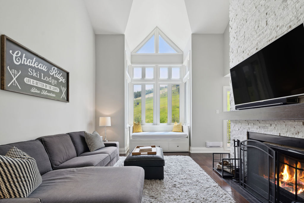 SHUTTLE, HOT TUB, SEASONAL POOL 5-7 minute walk to the Blue Mountain Village. This cozy 2 bedroom condo gives you immediate access to the action or a quiet place to relax by the fireplace while looking out at the mountain views. ★ ★ SMART TVs in living room (WIFI and Cable) and bedrooms (WIFI) ★ Family Ready! Games, booster seat, packnplay etc ★ Resort hot tub with indoor changeroom and washrooms Pool closed for the season ** Please note: hot tub is closed from Nov 3rd for approx 2 weeks