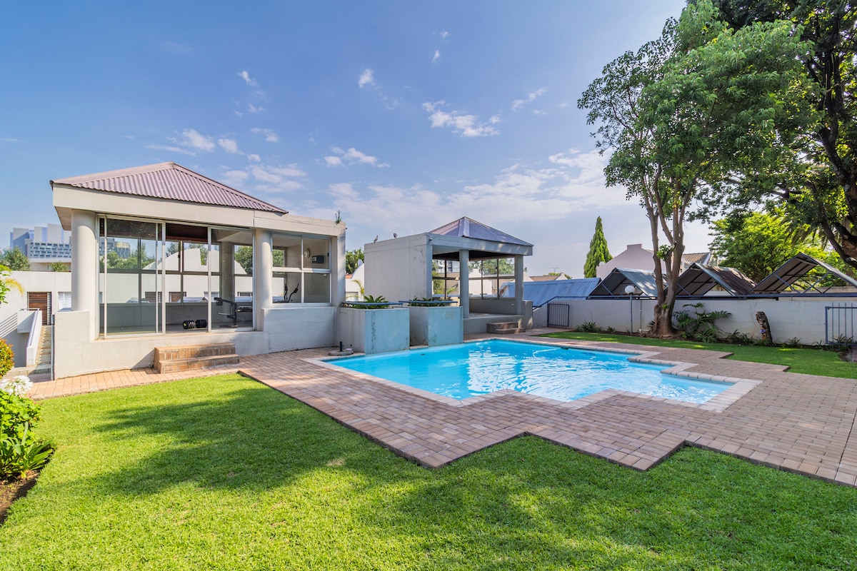 歡迎來到位於桑頓市中心的行政級3房度假屋,配備備用電源、水和無限WiFi,讓你隨時保持聯繫。 此旅居距離Sandton商業區、Sandton ICC和頂級餐廳僅2公里,是尋求舒適、私隱和便利的商務旅客、團隊和搬遷人士的理想選擇。 每間睡房都有自己的套房浴室,非常適合同行的同事。 享受專屬工作空間、寧靜花園和時尚共用起居空間