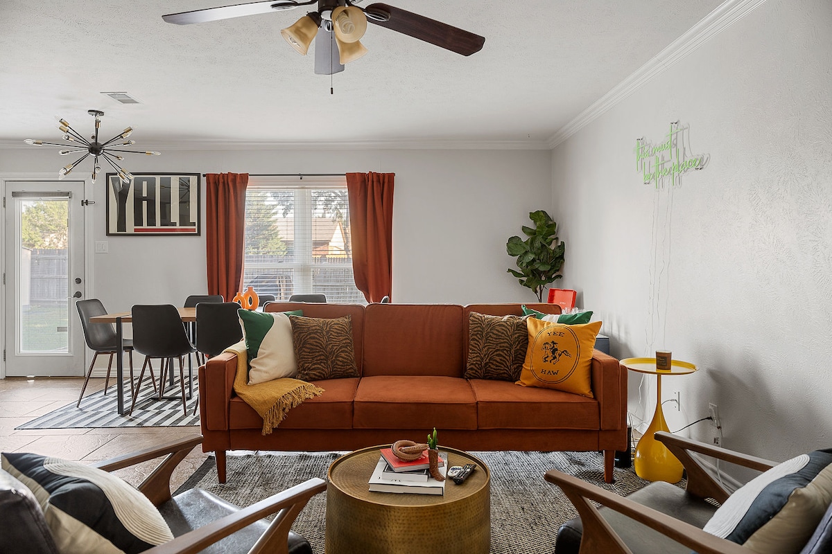 這間舒適、翻新的房源,有4間臥室、2間半浴室、2間放鬆的起居區,將為您提供美好的住宿體驗。在設備齊全的廚房烹飪,或在令人驚豔的露臺上放鬆身心。 每間臥室都有獨特的風格,讓您住得安心!享受附近的餐廳、購物和娛樂,如Top Golf、Hawaiian Falls (水上公園)、Grandscape。非常適合尋找難忘度假勝地的家庭或團體,靠近當地最熱門的景點! 禁止舉辦派對