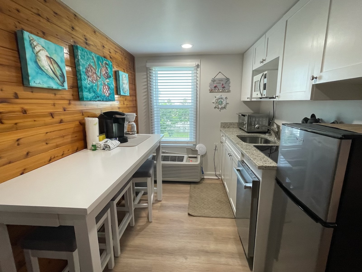 享受陽光、沙灘、海浪和充滿活力的夜生活。 這間單間公寓位於海灣海岸公共海灘對面,配有浴室、Hangout、Pink Pony,步行2分鐘即可抵達許多其他餐廳。 這種效率提供一張1.8米寬雙人牀、一間浴室、迷你廚房(配有迷你冰箱)、水槽、微波爐、烤麵包機和Kuerig。 座位包括一張小沙發、舒適的椅子和小廚房桌椅子。 有一個小衣櫃,可放置有手持蒸汽機的衣服。