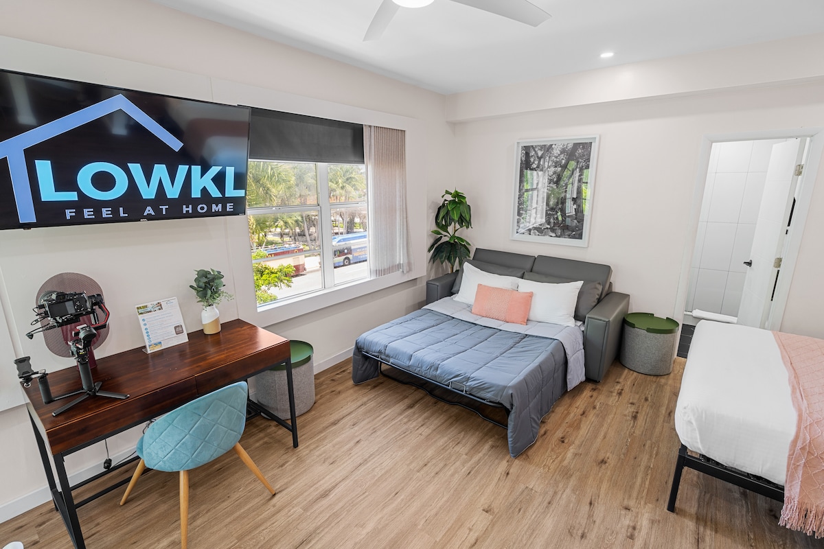 這間單間公寓位於海洋大道國會大廈,毗鄰克利夫蘭和範思哲大廈,這間單間公寓有一張標準雙人牀和一張日式牀墊,可容納3位成人,飯店提供免費基本WiFi。 該空間配有小廚房,非常適合製作早餐或小餐,您將登記為房客,並可使用泳池區域的屋頂泳池區域、泳池毛巾和躺椅。