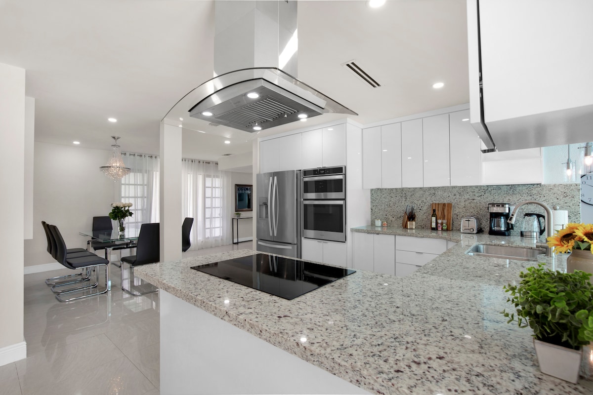 Welcome to our chic, redesigned home, conveniently located just a short drive from the beach. Experience the bright, open-concept living space and a state-of-the-art kitchen. Enjoy the beautiful outdoor dining area, gazebo, and sparkling pool—perfect for a relaxing day in style. This space has been crafted to uphold the highest standards of quality and comfort. - 8 min to Hard Rock Stadium - 20 min from Fort Lauderdale Airport - 25 min from Miami Airport - Heated Pool with water fountain