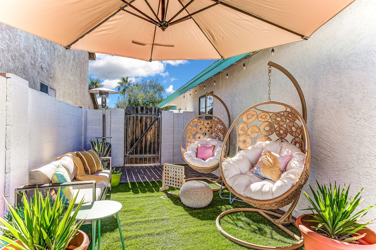 歡迎來到The Hidden Hacienda Scottsdale! 這是一個有趣、奇幻的度假勝地,擁有牛仔風格的裝飾、泳池、水療、卡拉OK和遊戲,非常適合單身女子、家庭或高爾夫度假。 可容納10人,配有舒適的床、智能電視、撞球桌和設備齊全的廚房。 在搖曳的棕櫚樹下休息,在迷你果嶺上練習揮桿,或在私人後院綠洲放鬆身心,享受舒適的座位火坑和戶外電視。 距離Kierland Commons、頂級高爾夫球場、春季訓練等地點僅幾分鐘路程!