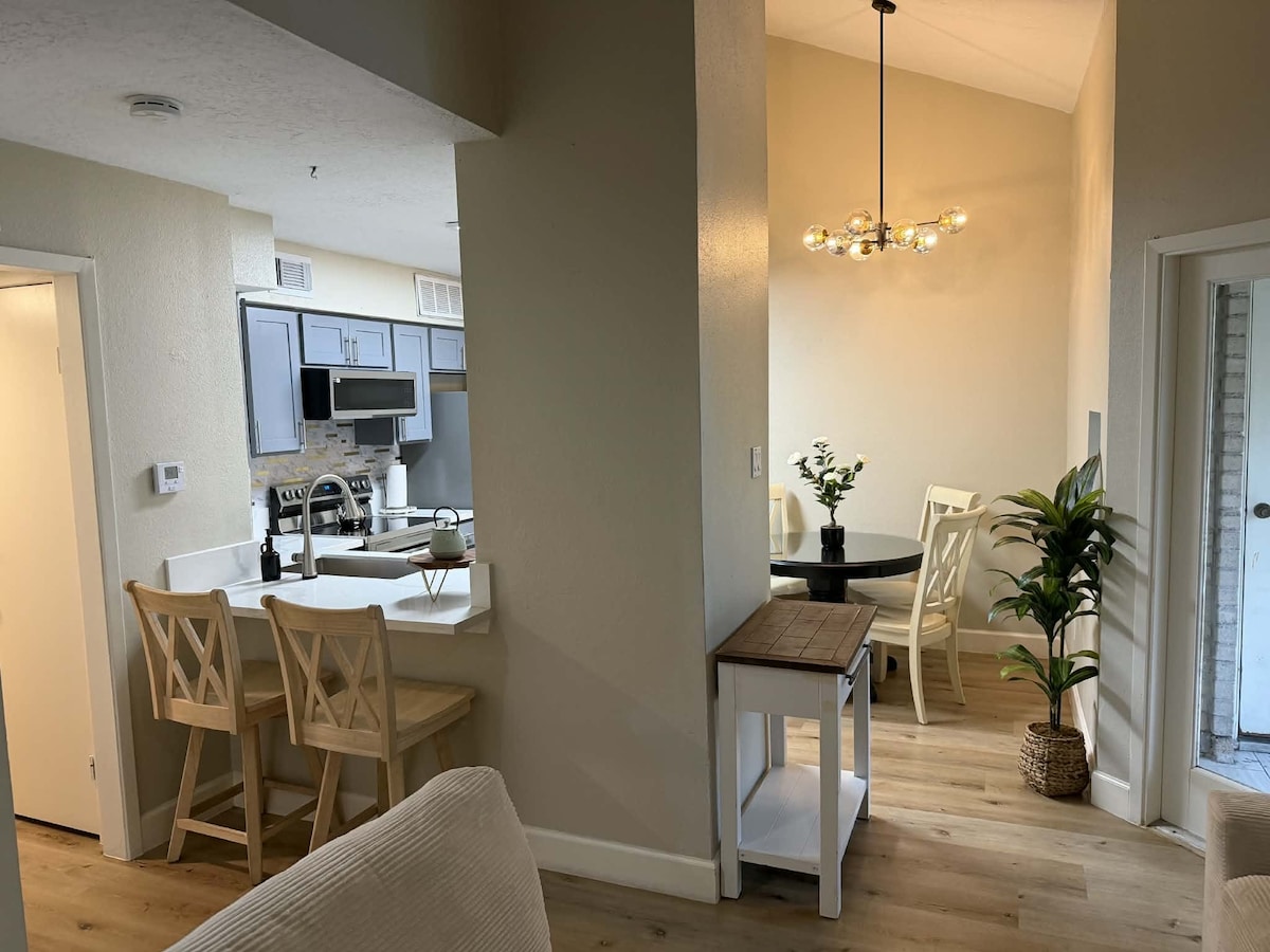 重新裝修,有很多窗戶。美容床墊、主要TEMPUR-PEDIC床墊、2張床、2 1/2浴室、書房和洗衣設施。沒有地毯。石英檯面。主臥室有陽台。高速WiFi。配有Roku的電視(登入您的Netflix、Prime Video )。 距離I-45高速公路3分鐘,非常適合通勤到IAH機場、休斯頓市中心等地。位於The Woodlands市中心,靠近Cynthia Woods Pavilion、Market Street和豐富的夜生活機會。 非常期待接待你!