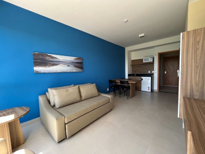 Acolhedor apartamento com wifi no Flat Ônix Residence, uma vaga de garagem. Excelente localização, 100 metros do Boulevard. Possui cama box de casal, cortina blackout, ar condicionado e guarda-roupa no quarto; na sala tem amplo sofá-cama, TV(não é smart), ventilador, ar condicionado, mesa e 2 cadeiras; cooktop, frigobar, microondas, pratos, talheres; agradável varanda com mesa e 2 cadeiras. 42m2. Portaria 24 horas, elevador, sauna, piscina (estará indisponível de abril a julho de 2026).
