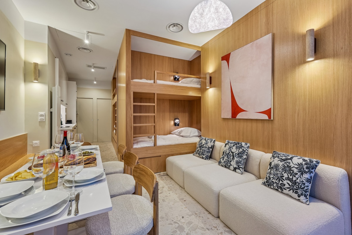 This Lavie Maison fully privatized hostel is a uniquely designed 42 m² (452 sq ft) in the heart of Paris, in the 2nd arrondissement. Located on the ground floor, it accommodates up to 8 guests with 2 double beds (140x200 cm) and 4 custom-built single beds (90x190 cm and 80x200 cm). It features 2 bathrooms, including one with a hot tub (whirlpool bath). Fully equipped kitchen, high-end amenities, and a smart, comfort-focused layout. Central location, close to shops and public transportation.
