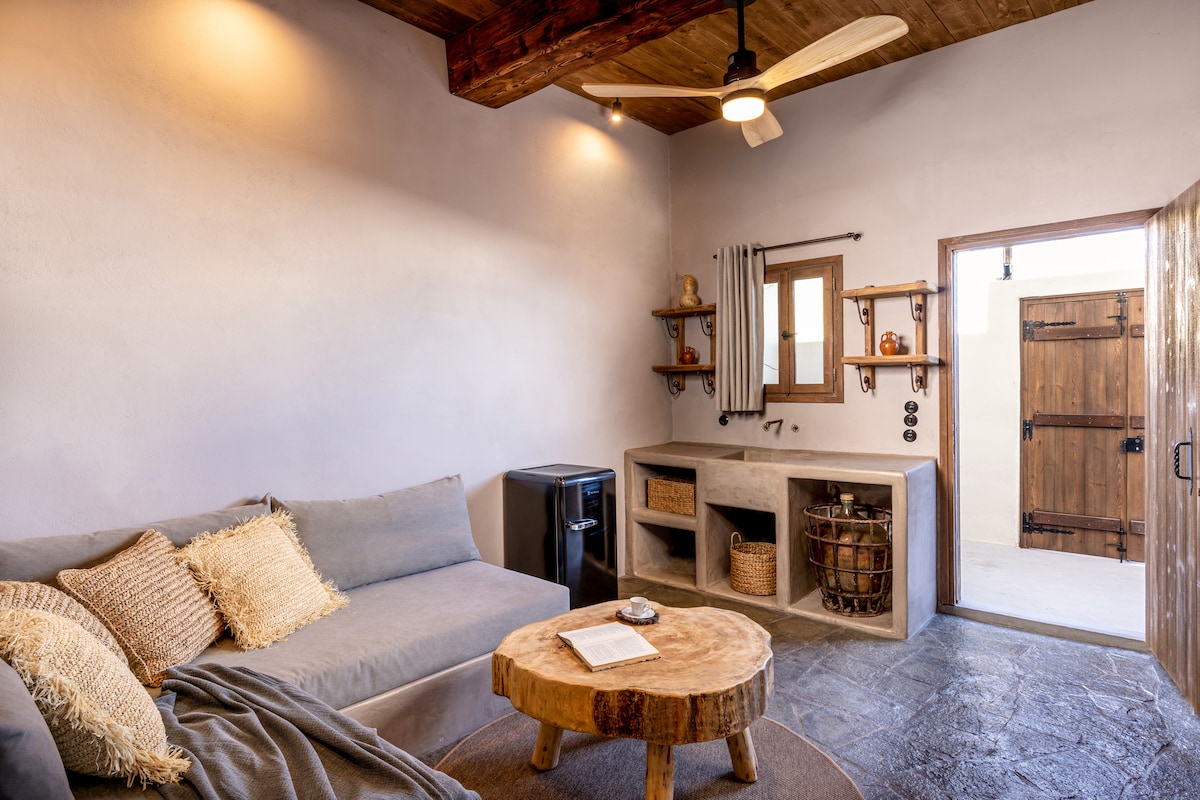 The New Earth Houses are a conscious retreat in authentic, non-touristic Santorini, created for travelers who seek peace, presence, and a deep connection with nature. The houses embrace yellow — the color of vitality and light — blended with earthy tones and natural green elements, creating a grounding, nurturing atmosphere . Ideal for couples and conscious travelers seeking spacious luxury accommodation in Santorini, to slow down, breathe deeply, and experience the island with elegance.