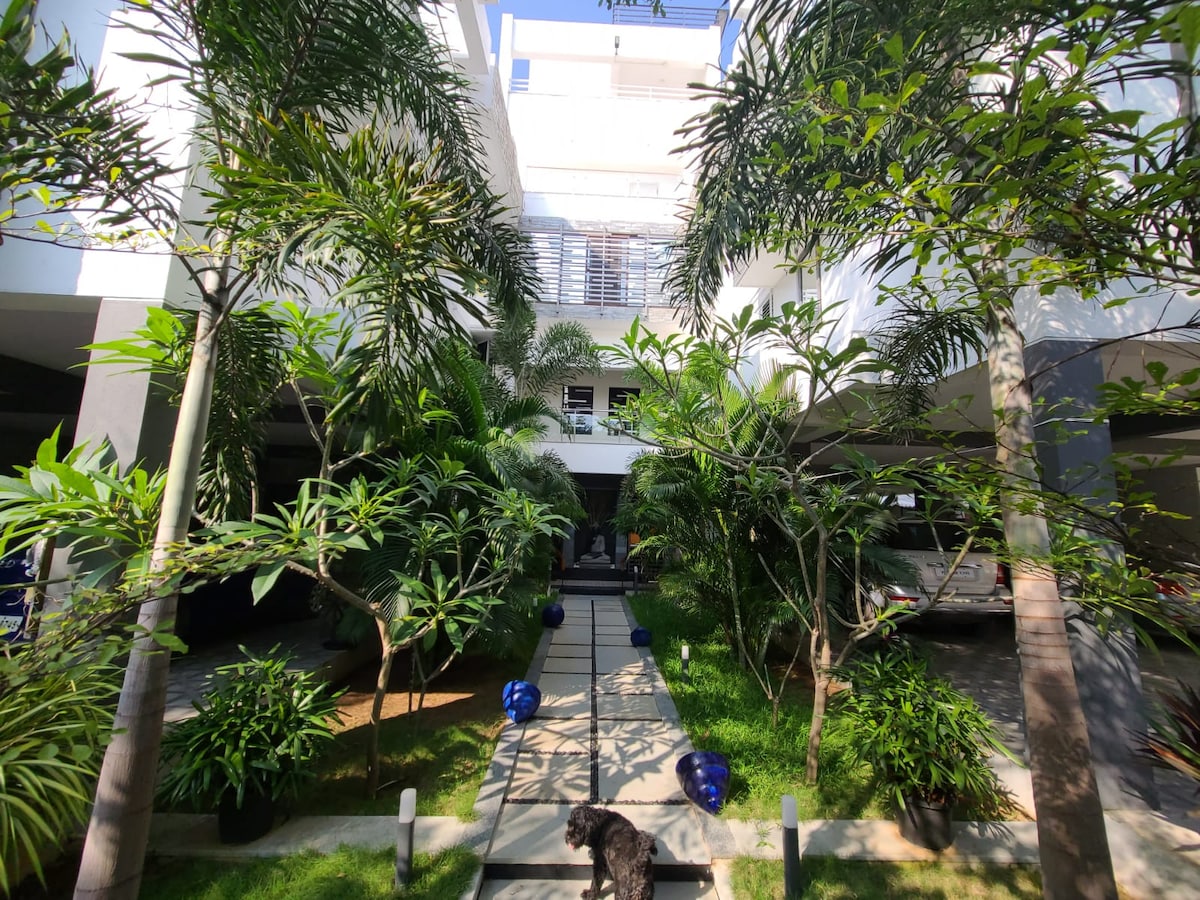 這間高級、寬敞且配備家具的旅居靠近東海岸路(ECR)、Thiruvanmiyur海灘和Marundheswarar寺廟。 這間別墅公寓是獨立的,家具齊全,客廳和臥室均設有冷氣。 這個空間非常寧靜,自然光線很美。 有3個美麗的陽台和有蓋的停車位。廚房配有基本用具和電動小工具。 請注意,對面正在施工,白天可能會有點吵。