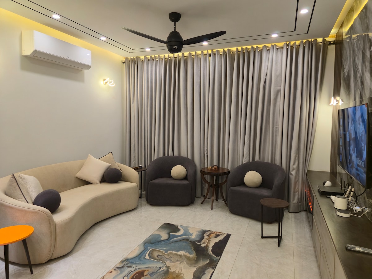 This Fully Furnished Apartment Includes: 4 Air Conditioners. Iron & Ironing Board Microwave Oven Refrigerator and Freezer Cutlery Set Soft Drinking Water Electric Kettle High-Speed Wi-Fi. Flat-Screen TV. Cold Water kitchen and bathrooms. Regular Cleaning Service. Indoor Games. Air Fresheners. Tea essentials. Comfortable bedding and linens Towels and basic toiletries Cookware (pots, pans, utensils) Dining table and chairs Wardrobe and storage space & more…