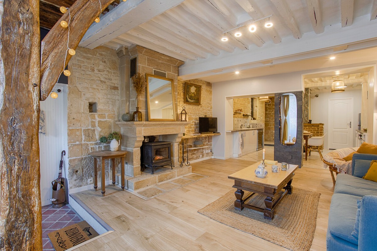 「歡迎來到這間歷史悠久的65平方米公寓,它完美地位於Abbaye aux Dames和Caen港之間。 有2間臥室,最多可容納4位旅人。 它的私人入口讓它有小屋的魅力。 非常適合情侶、朋友、家庭或商務旅行入住。 100–400米內有免費街頭停車位和付費公共停車場。」