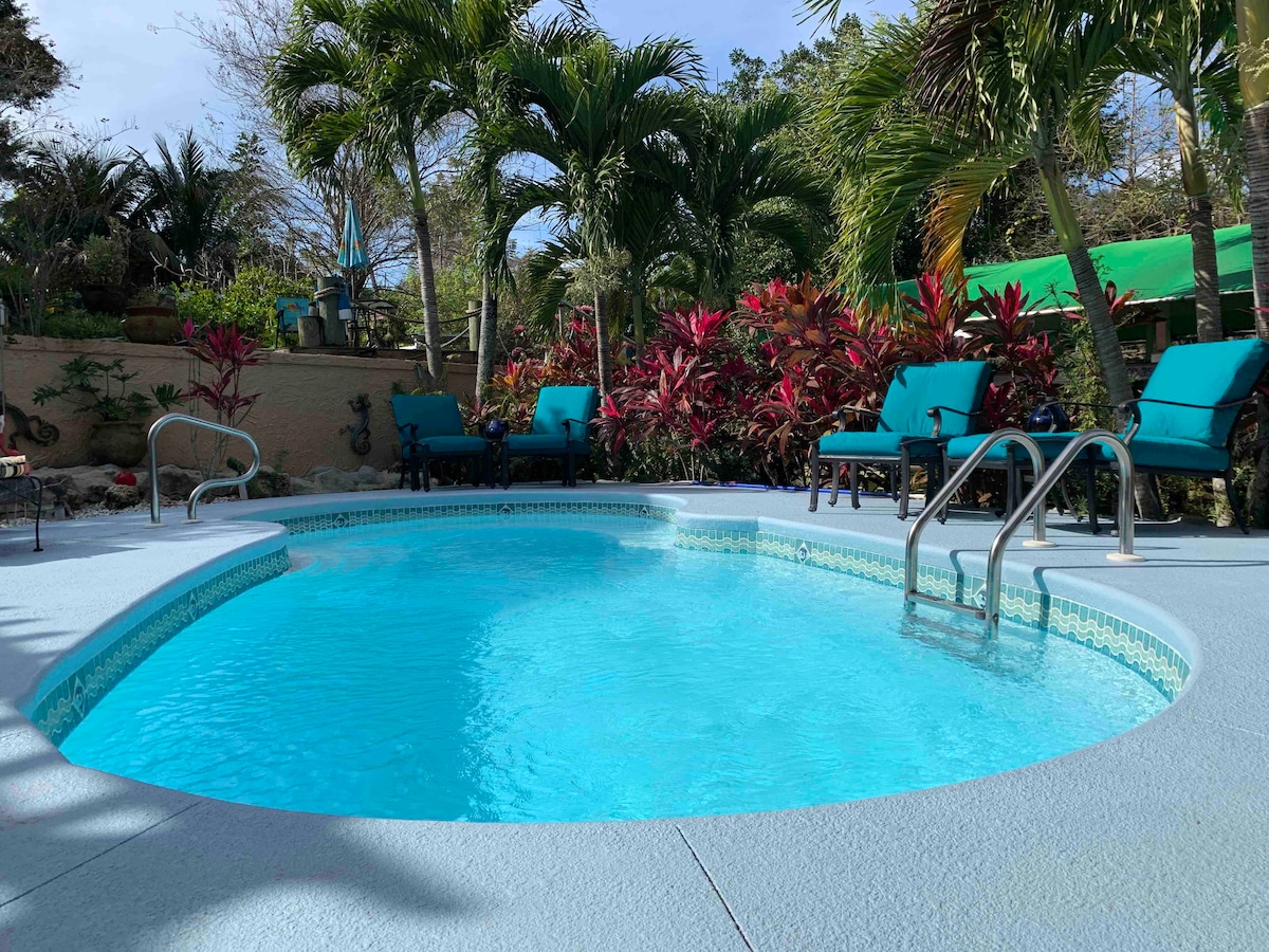 在這個獨特而寧靜的度假勝地放鬆身心,擁有巨大的植物園(照片顯示我們半英畝花園的植物)、水景和泳池通道! 我們距離海洋20-35分鐘,距離美麗的河流和連接運河更近。 你可以自己帶皮艇出發,或讓我們帶你前往當地碼頭,並將你的船隻或皮艇運送到那裏! 看到海牛、海豚、鱷魚和許多鳥類和其他野生動物! 請勿越過鄰近的房源。