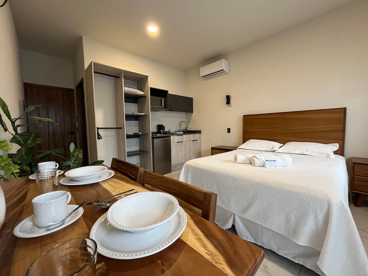 為您的旅程和日子提供一個壯觀的起點,結合不同的風格,提供獨特的體驗。充滿色彩的鄉村家具為這間現代公寓注入了活力。陽台是一顆珍貴的寶石。 單間公寓是一個開放的空間,所有活動都相互交流,感覺非常寬敞,您可以隨時通過一扇非常大的窗戶享受與露臺的聯繫,這扇窗戶為室內空間提供了充足的光線和城市的壯美景,它將成為您的家,我們最大的願望是讓您充分享受它,我們期待著您的到來! 一樓有一個城市花園,您可以在那裡享受多種藥用、食用植物,您可以種植有機作物供您個人使用,並使您的住宿更加豐富。 我們建議您享受它,因為這是一個非常漂亮的空間,設計得非常用心,我們希望您能體驗並享受它。我們期待著您的到來!!! 對我們來說,您的住宿和舒適是最重要的,我們將關注您的任何需求,以便立即解決它,我們很樂意等待您,並享受我們的公寓,這無疑是您的最佳選擇 公寓位於一個安靜、文化和美食區域,是體驗瓜達拉哈拉的理想之地。距離華雷斯市場 (Mercado Juárez) 或墨西哥市場 (Mercado México) 三個街區,步行 20 分鐘即可抵達歷史中心。 我們建議您步行遊覽城市,公寓地理位置優越,可體驗瓜達拉哈拉,靠近歷史中心、查普爾特佩克大道,位於一個安靜、文化和美食區域。 您可以享受我們美麗城市的許多景點,而無需花錢乘坐任何交通工具。 打開窗戶時,公寓的居住感非常愉快和溫馨,空間與露臺融為一體,您會非常享受。 晚上,從露臺上可以看到遠處飛機起飛,這是一場您可以欣賞的奇觀。 在自由街或華雷斯市場周圍(從露臺左轉 2 個街區即可看到),您可以在多家咖啡館享用美味的早餐,大多數咖啡館都有帶樹木和植物的露臺,您將體驗非常愉快和安靜的時刻。