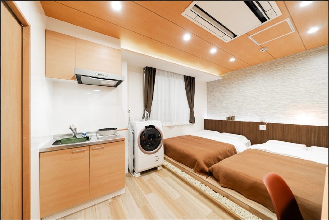 东京・墨田区|安静街角的三楼雅致房源|近浅草寺・晴空塔 在喧嚣城市的一隅,藏着一间静谧的小屋。 走进这间位于三楼的舒适公寓,仿佛回到了属于自己的小小世界。 房间格局 ・在这间雅致的302号房 ·洋式宽敞卧室(带电视) 配备两张宽1.4m长2.0m的双人床,柔软舒适,清新现代的布置让人一进门倍感轻松。 ・开放式厨房,配备基本的炊具,适合偶尔动手煮一顿简单的家常饭 ·为避免过敏或异味,室内不提供调味品,请旅客自行准备 卫浴设备 ・干湿分离式浴室,保持清爽整洁 ・配有一次性牙刷、吹风机等基础洗漱用品 ・洗衣机带烘干功能,出差或长住也无需烦恼衣物晾晒 温柔的便利 ・步行范围内有便利店、超市、当地美味餐厅 ・交通方便,散步3分钟即可到达东京晴空塔以及押上(最近)车站,步行15分钟即可达到浅草寺 ,车程50分钟达到梦幻迪士尼城堡乐园,程50分钟到达羽田国际机场,1小时直达成田国际机场,无需转机丝滑抵达。 ・房间位于安静街道一侧,无需担心喧闹,安心入眠 一句话的推荐 如果你想在东京过几天简单却温柔的日子,这里也许刚刚好。 ✔ 楼内设有【免费行李寄存室】 到达较早或退房后也不用拖着行李走✨