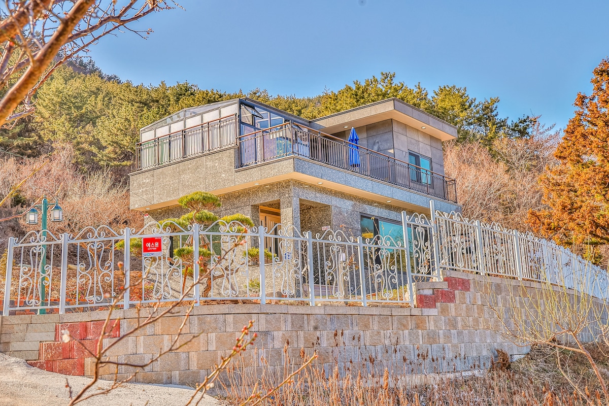 *Geoje Blue Sky*是獨立的鄉村住宅(1、2樓整層使用),在入住期間,您可以保持個人和家庭的隱私,因為它是一個獨立的空間,與其他客人沒有接觸。 我們正在盡最大努力進行防治和消毒,以防止新冠肺炎。此外,我們的房子被生成植物成分的柏樹林包圍,因此您可以享受非常清新的空氣。 從我們房源的一樓露臺和二樓陽臺可以看到大海,您可以在陽臺上與您的伴侶和家人一起享用咖啡或茶。此外,在冬季(11月至3月),為了讓您享受戶外活動和烤肉,我們在整個小屋安裝了防風膜和室內暖爐,以防寒冷,並考慮到房客的便利。 為♡房客準備了巨濟島、統營觀光地圖♡