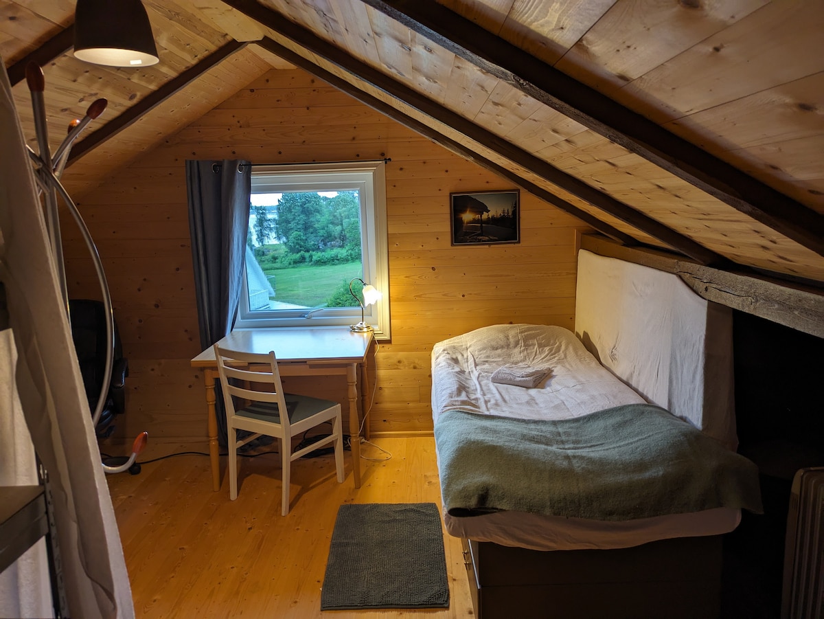 Velkommen til en hyggelig krok på loftet mitt! En ekstra seng kan settes inn (feltseng med god madrass). Det er mulig at en sover på sofa eller madrass i stuen. Dere deler kjøkken, bad og stue med meg. Huset ligger rett ved matbutikk og busstopp. Det tar 7 min med buss til sentrum. Fine turmuligheter. Kort vei til strand. Dyr er dessverre ikke velkommen grunnet allergi. Vær vennlig og informer dersom du kommer fra et hjem med hund, katt eller hest. Da dekker jeg sofaen med laken.