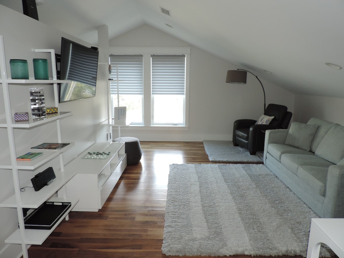 現代化的車庫上方單間公寓,有獨立入口和露臺。距離南沃爾頓海灘1.5個街區!享受寬敞的客廳/用餐區域和獨立的睡眠空間,配有加大雙人床。沙發也可以變成一張雙人床。 獨立式廚房,配有冰箱、爐台和微波爐。兩臺平面電視,配有私人Wi-Fi、直播、Netflix和HBO。享受30A最新的公共海灘,步行即可抵達,就在街尾。