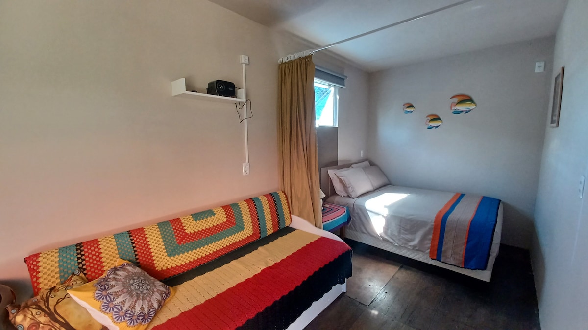 É um apartamento privado que fica no segundo andar, dentro de um pátio com mais peças para aluguel onde eu moro com a minha família. É um ambiente tranquilo e seguro. O espaço fica a 500m da praia da cal e 500m do pórtico da praia da guarita. O apto tem um quarto com uma cama de casal + uma cama de solteiro, um banheiro e uma cozinha. Temos estacionamento APENAS NO PERÍODO DA NOITE, em um pátio fechado e seguro, porém não é coberto. APTO TEM CÔMODO PARA ATÉ 3 PESSOAS, SEJAM CRIANÇAS OU ADULTOS.