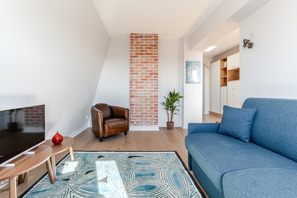 在這個安靜時尚的空間中放鬆身心,欣賞開闊的景觀(雙向)。 一個小陽臺,可供早餐和WiFi觀看他最喜愛的節目。 非常適合情侶、獨自一人或與小孩一起入住(提供折疊嬰兒床)。 您將擁有設備齊全的廚房、洗衣機、床單、毛巾... 位於安靜安全的住宅區,有自己的停車位。 步行10分鐘即可抵達海灘,步行5分鐘即可抵達Marais。享受!