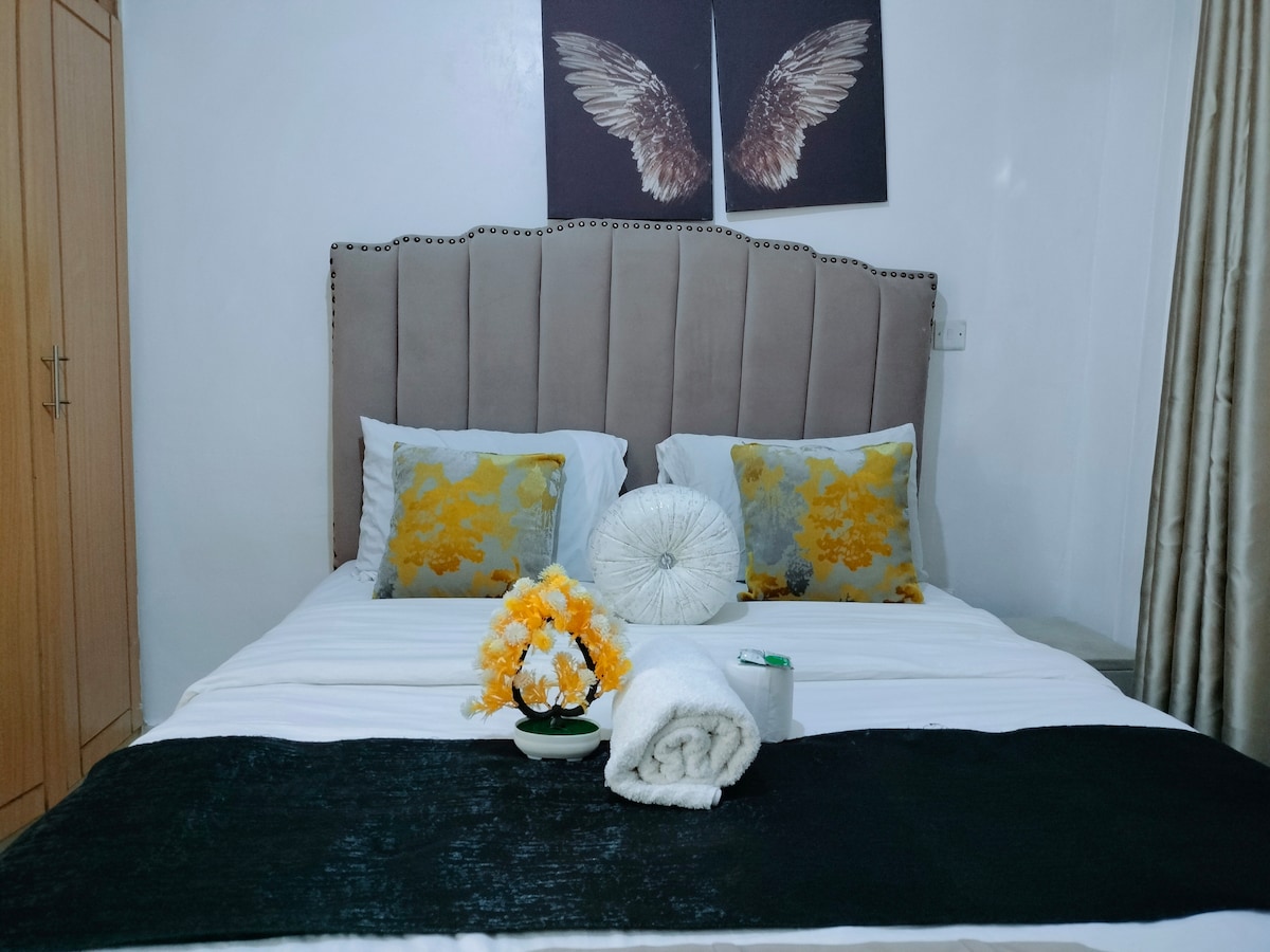 歡迎來到您的家外之家! 這間舒適時尚的1BR位於Lumumba Drive ( Tsavo Royal Suburbs ) ,步行即可抵達位於Roysambu的TRM Mall。 享受快速WiFi、Netflix、自行辦理入住手續、全套廚房、熱水淋浴、電梯和免費泊車。 包括免費機場接送和免費水、糖和咖啡。 安全、安靜,非常適合工作或休息。 Karibu !