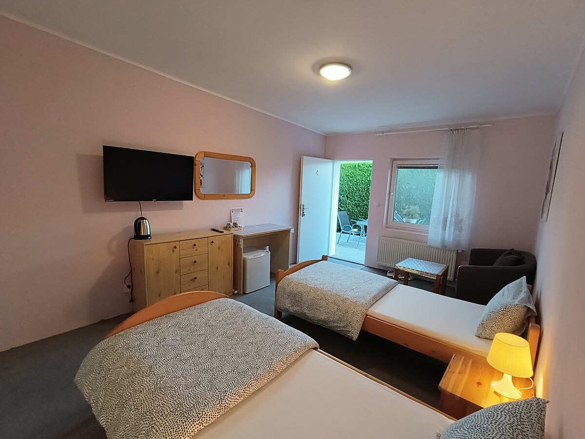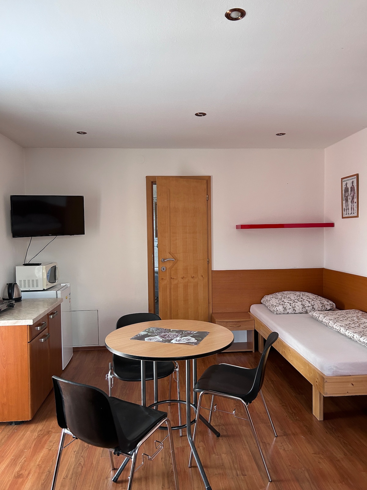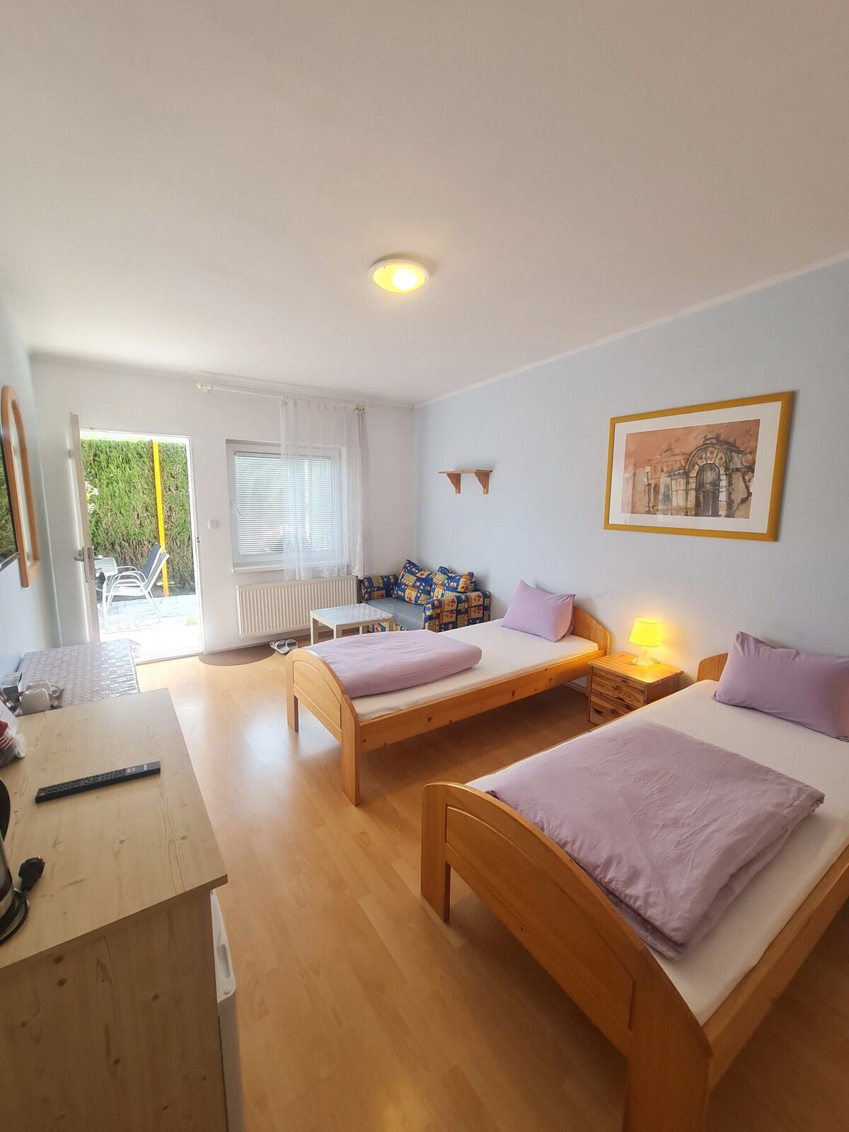 寬敞的公寓,配有私人陽台和私人浴室。 公寓還設有小廚房,配有電熱水壺、微波爐和雙電磁爐。 餐具或陶器是廚房的一部分。 您還可以使用香料、茶或咖啡。 自助早餐,每人7歐元 床位可變,可供3張單人床或1張加大雙人床和1張單人床。 請告訴我們你的偏好,我們會為你安排 你將被收取每人每晚2歐元的城市稅費
