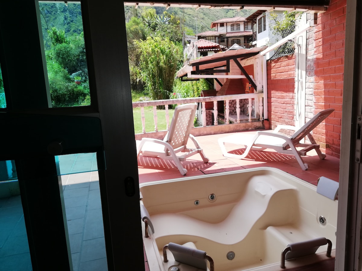 Relájate en esta escapada única y tranquila en la ciudad de Baños de Agua Santa, disfruta de esta hermosa mini suite misma que consta de áreas verdes, cancha de fulbito, jacuzzy, bbq completo con horno de pan, mirador privado con vista de 360 grados del barrio, tv cable, internet, smart tv de 32 pulgadas, mini cocina con menaje completo para 2 personas, baño completo, el barrio es seguro y está a 5 minutos del centro de la ciudad, los accesos son privados así como el garage para el auto.