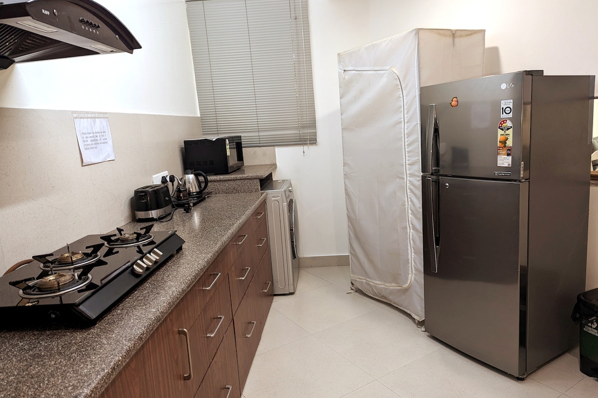 這間全新的2BHK公寓配有明亮、乾淨的空調臥室,讓您享受舒適的住宿體驗,非常適合家庭、NRI和商務旅客。 房源提供設備齊全的廚房,配有RO水、電磁爐、餐具、電鍋、冰箱、水壺、高速Wi-Fi、熱水器、逆變器備用、智能電視和有蓋泊車位。 使用 RoboTouch 高級按摩椅放鬆身心。 距離ORR 8號出口僅15分鐘,靠近醫院、超市,Swiggy/Zomato不到10分鐘。