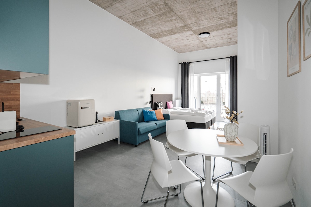 We rent here a bright, small, cute, fully equipped apartment with its own entrance, kitchen, bathroom and terrace. The apartment offers everything you need in a small space: a bright living/dining room with an IKEA sofa bed (bed with slatted frame and mattresses), a kitchenette with ceramic hobs, a closet, fridge and a new, beautiful shower room with window.
