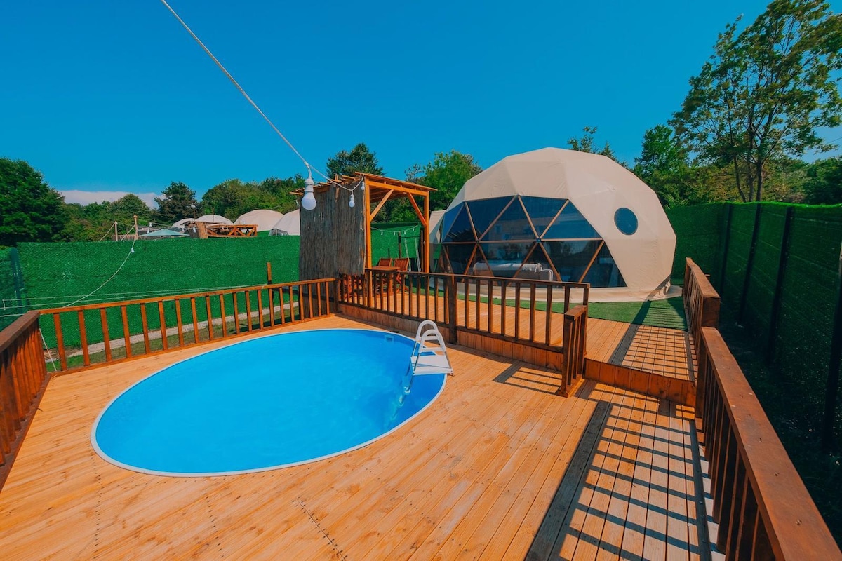 Sunyear Glamp House – Urla的熱帶度假勝地 在1000平方米的熱帶花園中,香蕉樹下的巴厘島風格的泳池、夜光涼亭、開放式廚房和燒烤、寬敞的座位和日光浴區域。 提供Wi-Fi、冷氣和私人泊車位,無論是浪漫度假、與家人或朋友一起玩樂……在星空下,在大自然中享受完全不同的假期體驗。