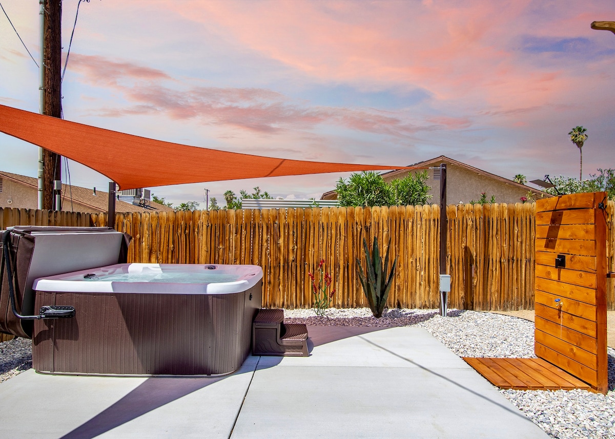 歡迎來到Cactus 29!這個沙漠度假勝地距離約書亞樹國家公園北門10分鐘。我們的房源配有電動車充電器、車庫通道、中央暖氣和空調、按摩浴缸、吊床、沙包遊戲板、全圍欄的私人後院、露臺、烤肉架、桌遊、快速可靠的WiFi和每個房間的遮光窗簾。尋找現代化的升級,在後院綠洲放鬆身心,從戶外露臺甲板欣賞約書亞樹國家公園的山景,或躺下享受觀星!