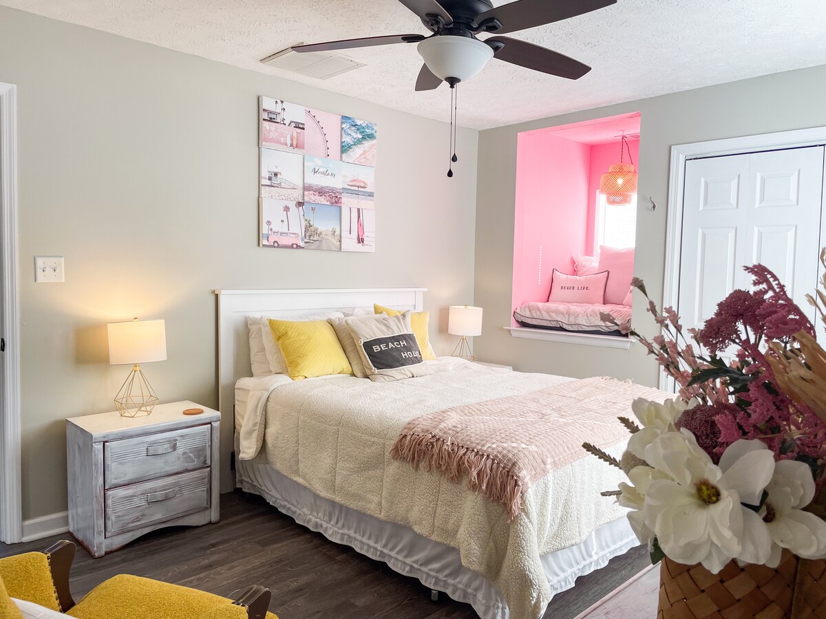 Escape to our luxurious, colorful beach view corner suite on Tybee Island for up to 5 guests! This artfully designed condo offers breathtaking ocean & pool views, private beach access, and a large pool. Perfect for a family getaway or girls' trip, its central, walkable location puts you steps from shops & dining. Enjoy a unique, vibrant retreat that's anything but your basic beach house.