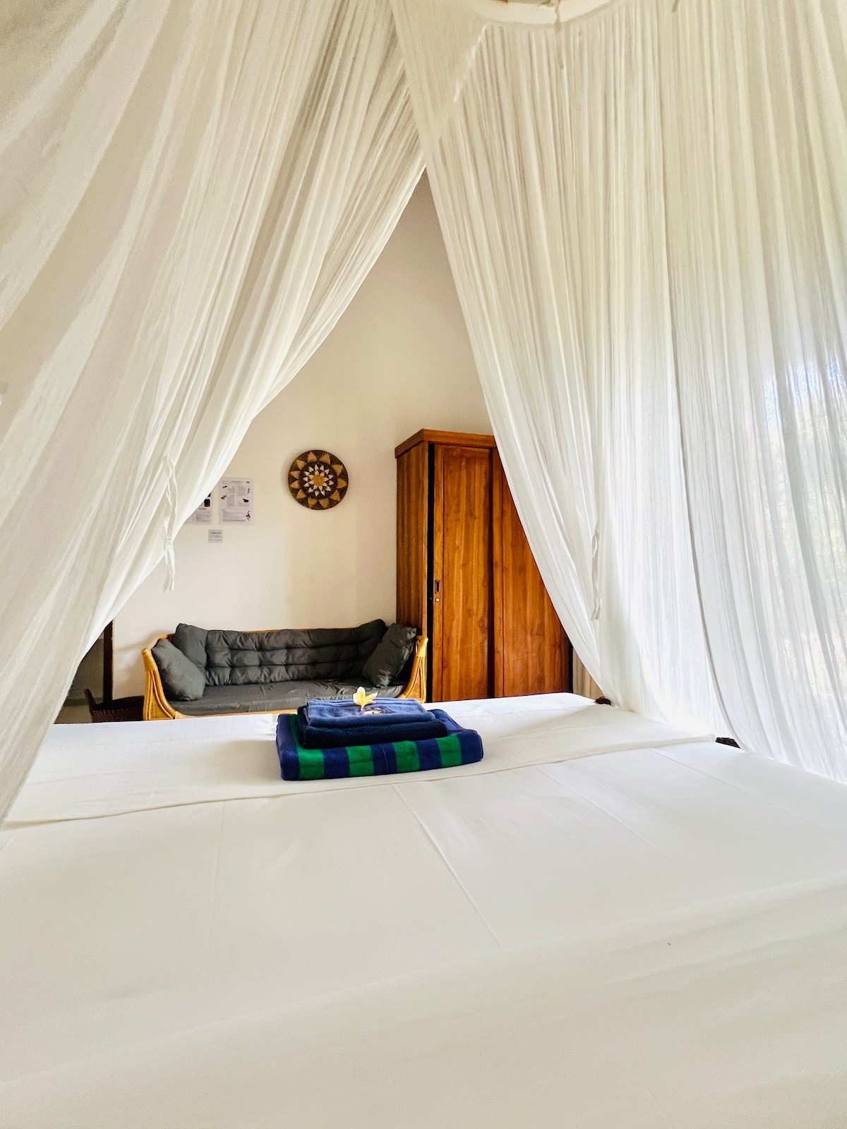 豪華私人別墅,配有6x3公尺的泳池。安全、私密、安全。郁郁葱葱的花園和遮蔭但露天的廚房,可在泳池旁用餐和放鬆。配有雙人床、室外浴缸和淋浴間、魚塘景觀、設備齊全的廚房。空調、電視、極佳的WiFi、每日清潔和早餐套餐。我們距離主要道路步行8分鐘,或短途摩托車。這意味著安靜祥和,沒有汽車噪音。如有需要,我們的員工很樂意開摩托車接送您。