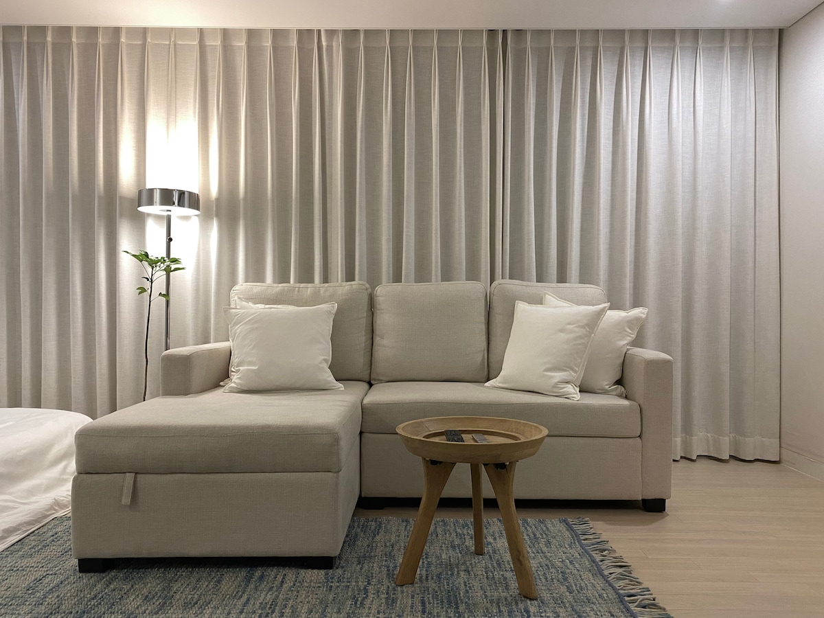 ※ 此房源已登記住宿業,是合法房源 (家具和小物品的位置或設計可能會略有不同。) ※請按確切人數預訂。基本住宿費最多可供2人入住,最多可供3人入住,3人以上將收取額外費用。 ※ 入住期間,前門門鎖密碼僅供房客使用,因此非常安全。 ※ 重新清潔會產生費用 海雲臺著名景點美浦海灘火車(步行)清沙浦、松井火車之旅 步行即可抵達九南路、水族館、The Bay 101、冬白島、海雲臺溫泉、月出山口、海雲臺傳統市場 俱樂部迪綠洲水上公園和水療中心 35% 折扣、水族館折扣、遊艇之旅折扣優惠券 1分鐘內即可抵達海雲臺海灘(馬路對面) • 24 小時免費行李寄存(退房後也可使用) • 免費停車位、Netflix、Wi-Fi 免費使用健身中心和高爾夫球場 • 步行即可抵達海雲臺地鐵站、長途巴士站和市內巴士站