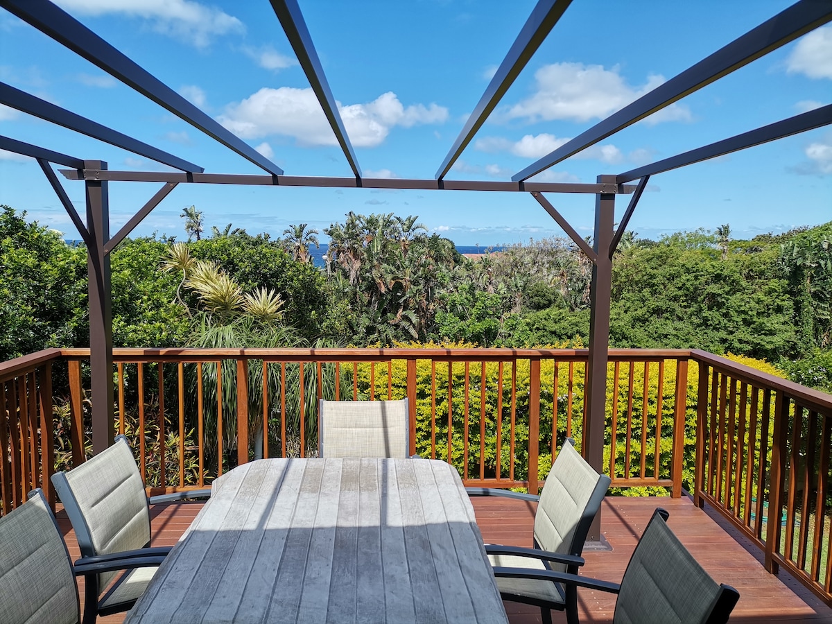 Spacious, comfortable home that over-looks the Indian Ocean. 3 en-suite bedrooms, sleeps 6, 1 sleeper couch, for 2 children under the age of 12 . Ideal for Businessmen and women and for family vacations. View the whales from your bedroom and visit stunning beaches nearby! many golf courses are along the beautiful Hibiscus Coast. Don't miss Lake Eland Game Reserve, The Swing, Zip Line and more. Visit the Wild Coast Sun and Water World. Professional Whale and Dolphin excursions nearby.