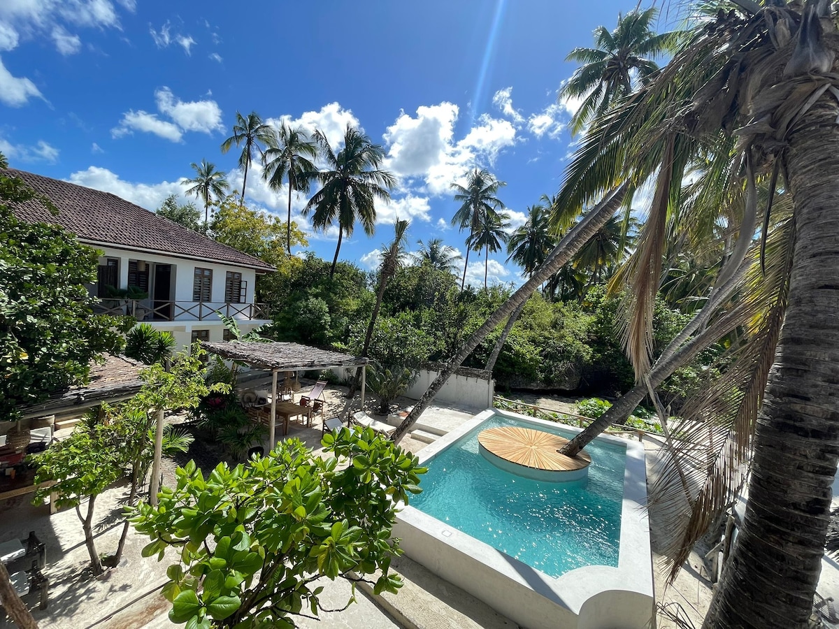 入住。感受。歸屬。 🥭 早餐選擇: 可應要求提供新鮮自製早餐(額外收費)。 🏡私人房屋,設有泳池,距離大海和Jambiani的白色沙灘僅5分鐘路程。 2–6位旅人:一樓2間套房臥室+ 1間通風良好的屋頂套房(簡單而迷人)。 🍃開放式廚房、露台和花園。 💡 Wi-Fi、太陽能備用、客房清潔和洗衣服務(按需要安排)。 ✨ Bora Pamoja Homes – Jambiani 的寧靜、時尚和私密。