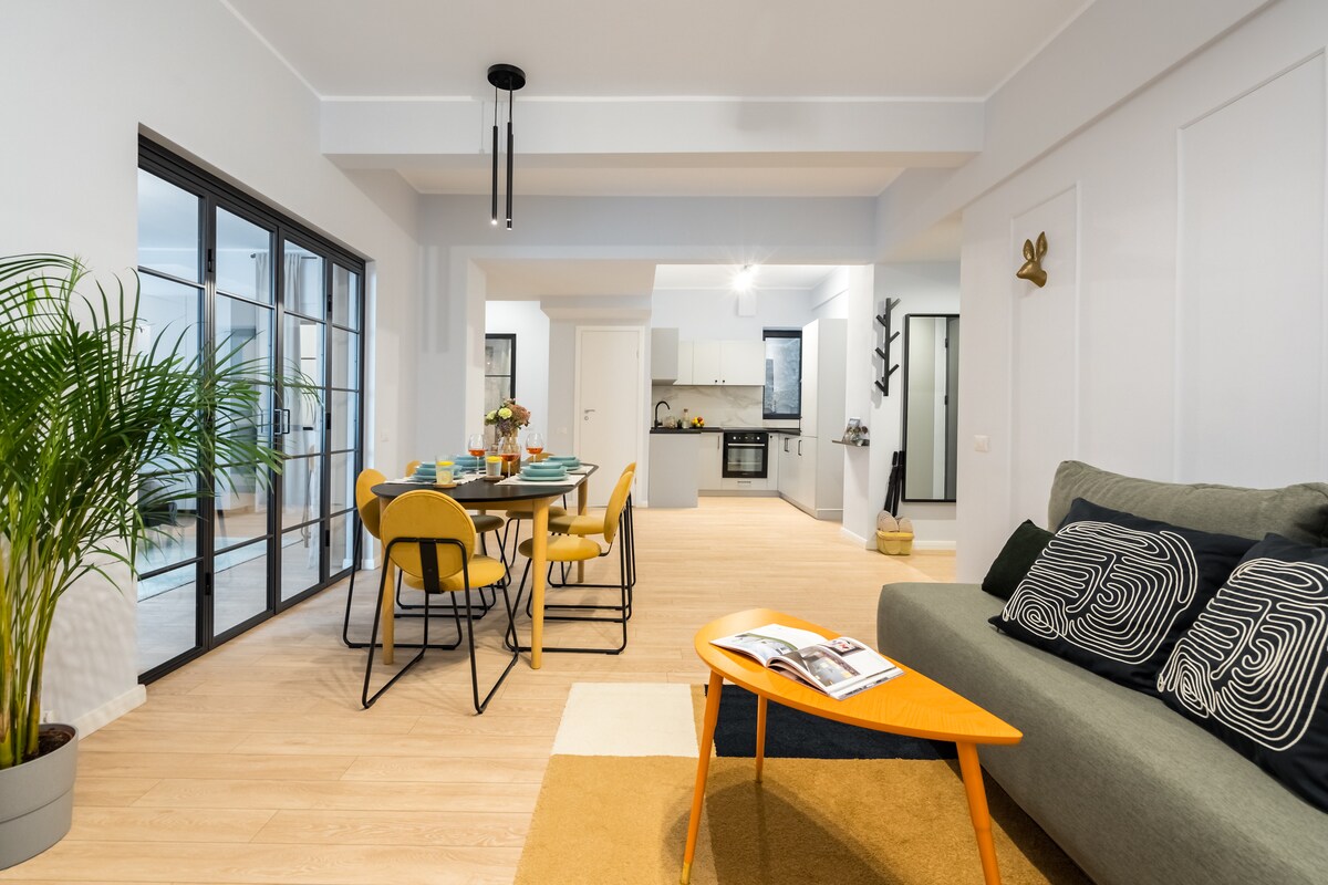 布加勒斯特市中心的美麗兩房公寓。 步行即可抵達大學廣場(3分鐘)和舊城區(7分鐘)。 客廳區域開放,配有舒適的沙發、漂亮的用餐區和兩張扶手椅。 設備精良的廚房,備有優質電器。 兩間臥室,配有舒適的床鋪、充足的儲物空間和專屬的工作空間。 位於80年代非常堅固安靜的建築中,增加您的舒適度和良好的睡眠。 立即預訂,祝您住宿愉快!