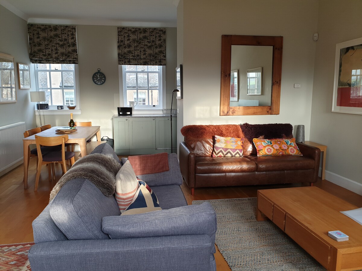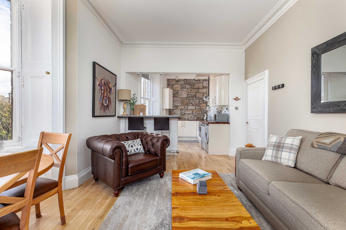位於聖安德魯斯市中心的明亮寬敞公寓。 黃金地段,就在南街旁邊。步行 5-10 分鐘即可抵達商店、餐廳、大學、舊球場、海灘和廢墟。免費公共停車位。 新翻修。從天花板到地板,一切都是全新的。設備精良、現代化和開放式廚房。電視和WiFi。舒適、舒適、寧靜。全新英國特大號中等硬度床墊,由天然英國纖維製成,以及全新中等硬度雙人沙發床。祝您有個好夢!