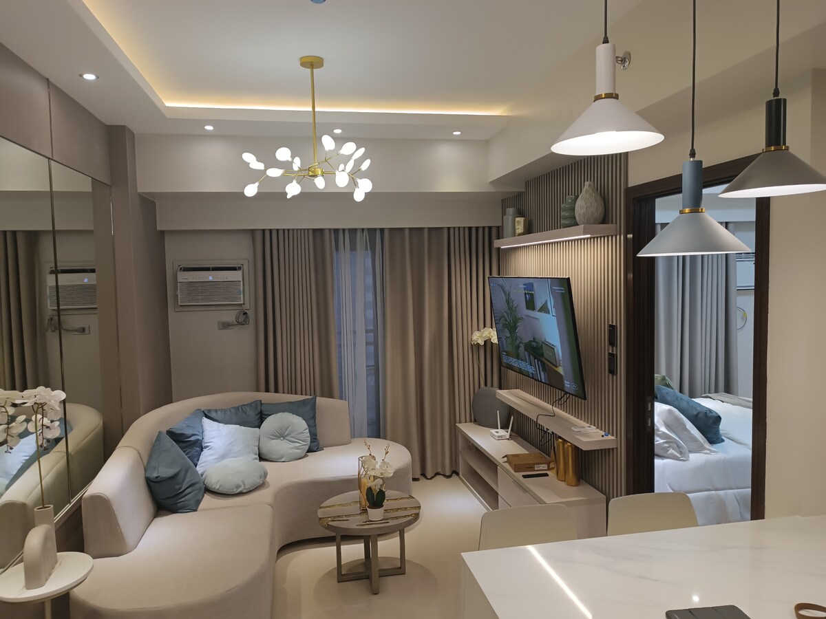 在我的豪華1間臥室閣樓享受您的短期或長期住宿,配有陽臺,在舒適的加大雙人床或舒適的皮革沙發上玩我們的Nintendo Switch遊戲機,在55英寸電視上觀看Netflix電影,或使用快速WiFi、打印機、掃描器高效工作。 公寓配有奢華的家具和設備。 單位位於馬卡蒂的SMDC AIR RESIDENCES。