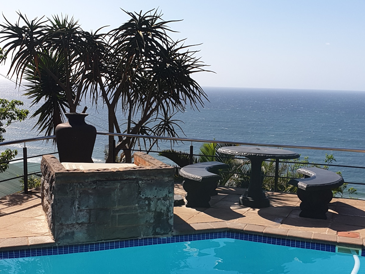 您自己的寧靜天堂。在大露臺上放鬆,俯瞰印度洋,就在您面前,鯨魚和海豚玩耍。 這間配有空調的 1 間臥室小屋,擁有私人海景,距離海灘僅 80 公尺。 休息室配有50吋平面電視和全DSTV ,設備齊全的廚房配有冰箱/冷凍庫。 免費使用光纖高速WiFi。 備用逆變器電源 開車進入,有安全的私人停車位。位於Marine Drive沿線的好地方。