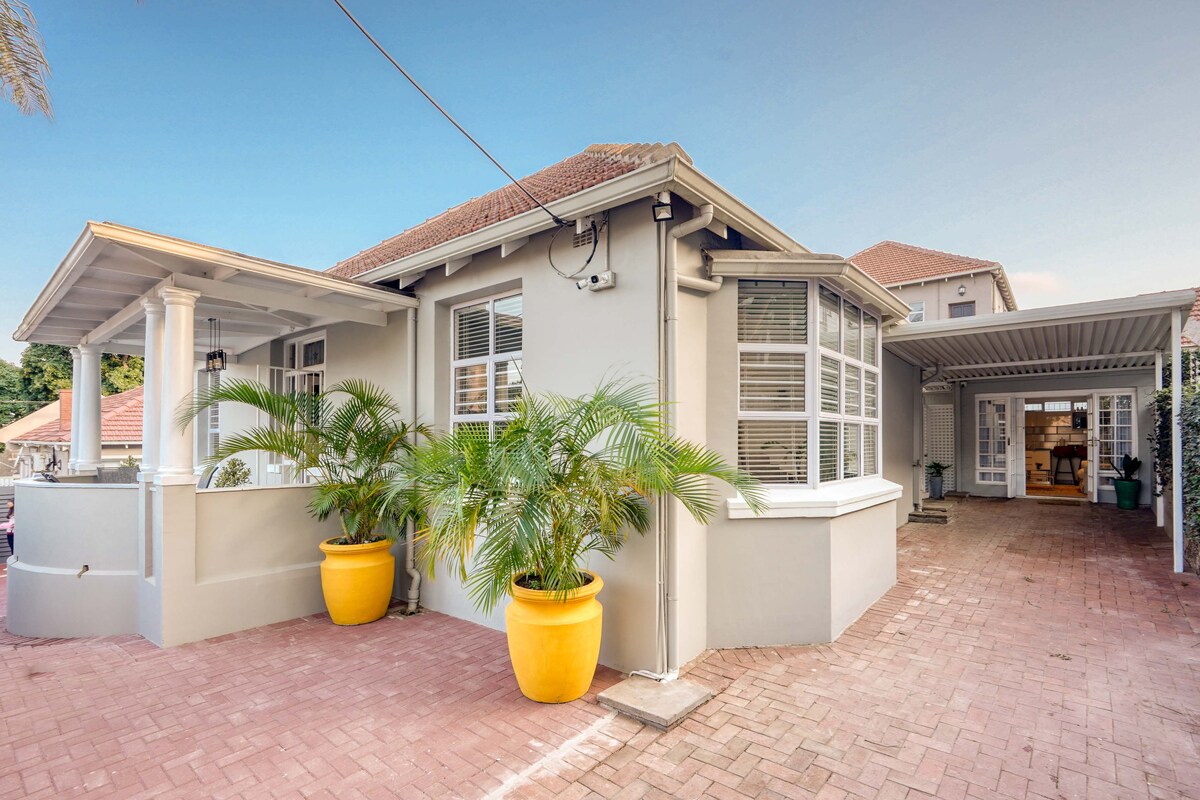 這間獨立小屋寬敞( 66平方公尺) ,寧靜迷人。位於安靜的綠色格倫伍德郊區,有咖啡店、瑜伽/普拉提設施,靠近設施和商店。 距離海灘和大型商場不遠。小屋配有1.8公尺寬雙人牀、空調、套房淋浴間和浴室、配套廚房、DSTV (所有頻道)、WiFi和安全的路邊停車位。 請注意,長達一週或一個月的預訂可享有折扣。