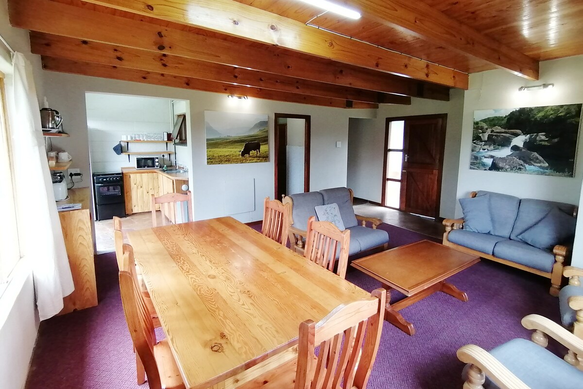 Mountain views, Amazing views, Solitude, Peace, Open Spaces, Countryside Atmosphere, Free parking, great for pets, relaxing, many nearby amenities. Berg House 29° 2'13.87"S 29°26'0.74"E Sleeps 6 Adults and child cot or bed can fit comfortably. There are 3 Ensuite Bedrooms There is also a 2-sleeper cottage available on the property as a separate booking.