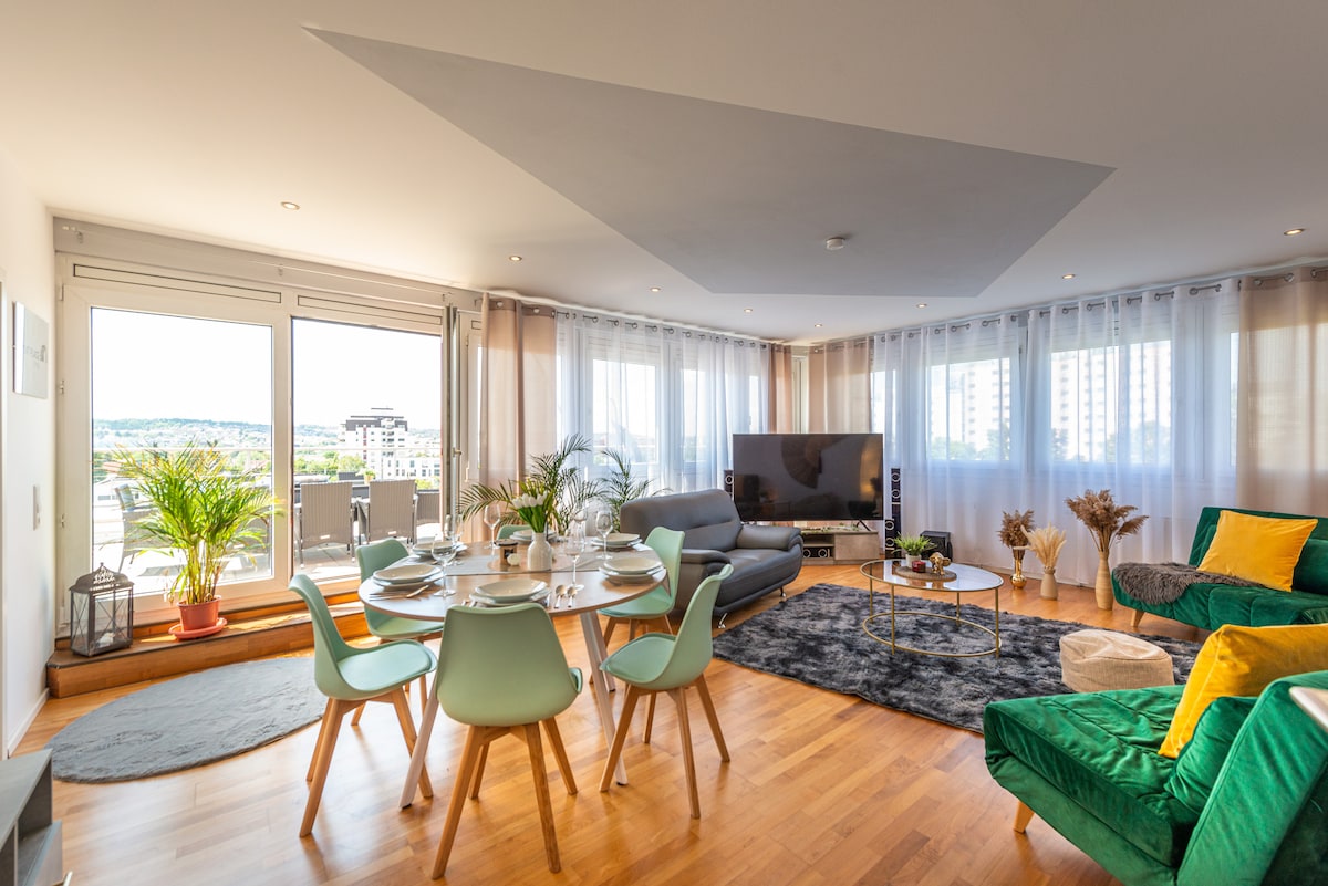 歡迎來到這個美麗的頂層公寓,為您提供短期或 長期住宿,靠近斯圖加特機場和展覽中心,提供一切: → 4 張特大雙人床 → 2 間浴室 → 3 間臥室,最多可容納 8 位房客 75 吋→智慧電視、NETFLIX 和 Amazon Prime → 藍牙電影院音響系統 iPad → 高速網路 → 健身器材和乒乓球 → NESPRESSO 咖啡 → 小廚房 → 洗衣機/烘乾機 → 免費停車位 → 步行2分鐘即可抵達商場